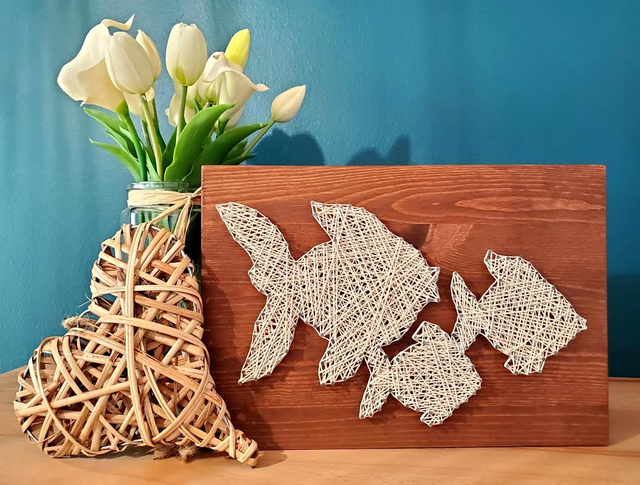 Ce Kit comprend une planche en bois robuste (24cmx35cm), poncée et lasurée couleur teck, de la ficelle en coton ivoire, une centaine de clous, une attache en laiton et le gabarit de plusieurs poissons, que vous pourrez disposer selon vos besoins et envies sur le support.